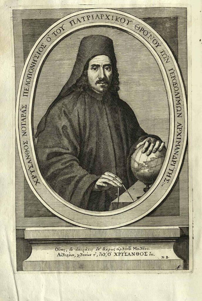 Kinsman and successor of Dositheus Notaras, the patriarch of Jerusalem Chrysanthus Notaras (1707-1731) was one of the most erudite Greeks of his time. Educated in Padua and Paris, he wrote works of theology, history, geography and the natural sciences, traveled as far afield as Moscow and Georgia, and maintained correspondences with both Western and Ottoman scholars (the latter, in Turkish). In his Syntagmation, published in Wallachia in 1715, he gives an organizational and geographical description of the entire Orthodox world of his time, enumerating the dioceses and structures of the Patriarchates of Constantinople, Alexandria, Antioch, Jerusalem and Moscow, as well as the autocephalous churches of Ochrid, Cyprus, Peć, and Upper and Lower Georgia….
