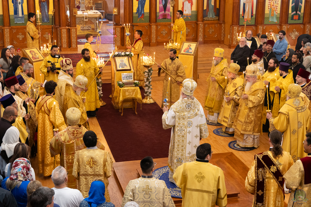 His Beatitude presided at the celebration of the hierarchical Divine Liturgy on Sunday morning. Concelebrating with His Beatitude were His Eminence Archbishop Alexei of Sitka and Alaska, His Grace Bishop Matthew of Sourozh (MP), His Grace Bishop James of Sonora (ROCOR), His Eminence Archbishop Benjamin of San Francisco and the West, His Eminence Archbishop Michael of New York and New Jersey, His Grace Bishop Andrei of Cleveland, and His Grace Bishop Gerasim of Fort Worth. Also serving with the hierarchs were Archpriest Alessandro Margheritino, Chancellor of the Orthodox Church in America, Archpriest Daniel Charles, Chancellor of the Diocese of Alaska, Priest Thomas Rivas, Dean of the Cathedral, Archpriest Nicholas Molodyko-Harris, former Dean of St. Innocent Cathedral, Priest Mark Rashkov, Vice-Chancellor of the Patriarchal Parishes, Archpriest Timothy Hojnicki, Vice-Chancellor of the Diocese of Eastern Pennsylvania, as well as many other diocesan and visiting clergy.