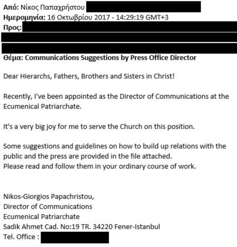 On Oct. 16, 2017, an email purporting to come from Papachristou, who was just being appointed as spokesman, arrived in the inboxes of about a dozen Orthodox figures.