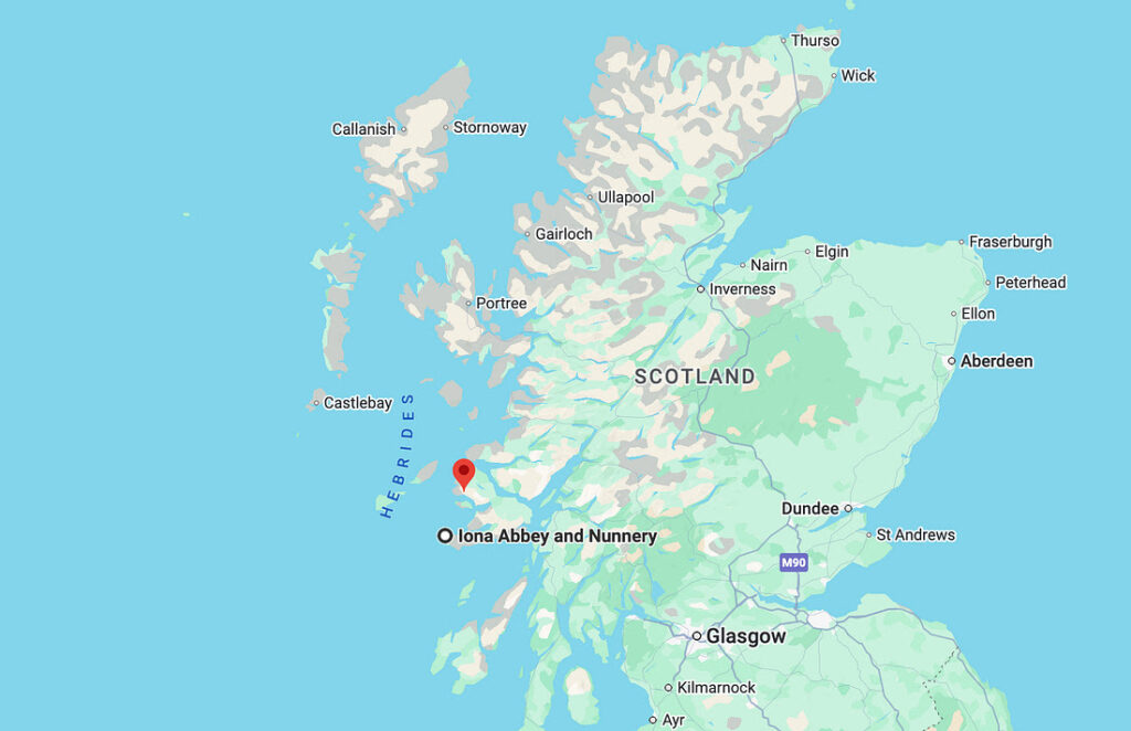 And here is a screenshot from Google Maps to situate you. The red marker is where the Mull monastery is; the Iona monastery is labeled. Did you know that Iain McGilchrist lives not far away, on the Isle of Skye? No wonder it’s so hard for him to travel!